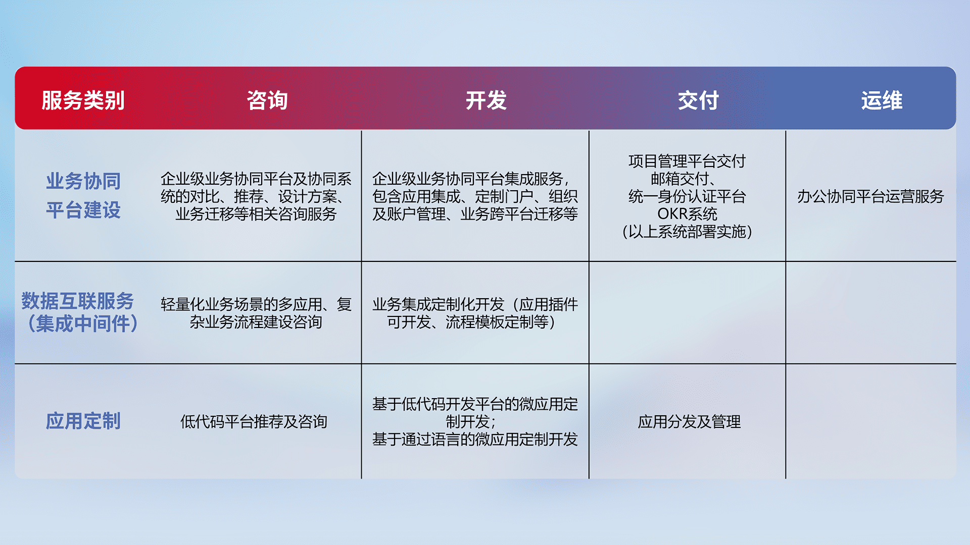 针对钉钉、、企微、、IDaas等平台级产品提供产品的规划、、方案、、交付、、、、定制化开发等服务,,,实现如统一协同办公、、智能客户服务、、、混合会议管理、、智能数据查询、、、等业务场景,,,,实现数字化转型。。。。